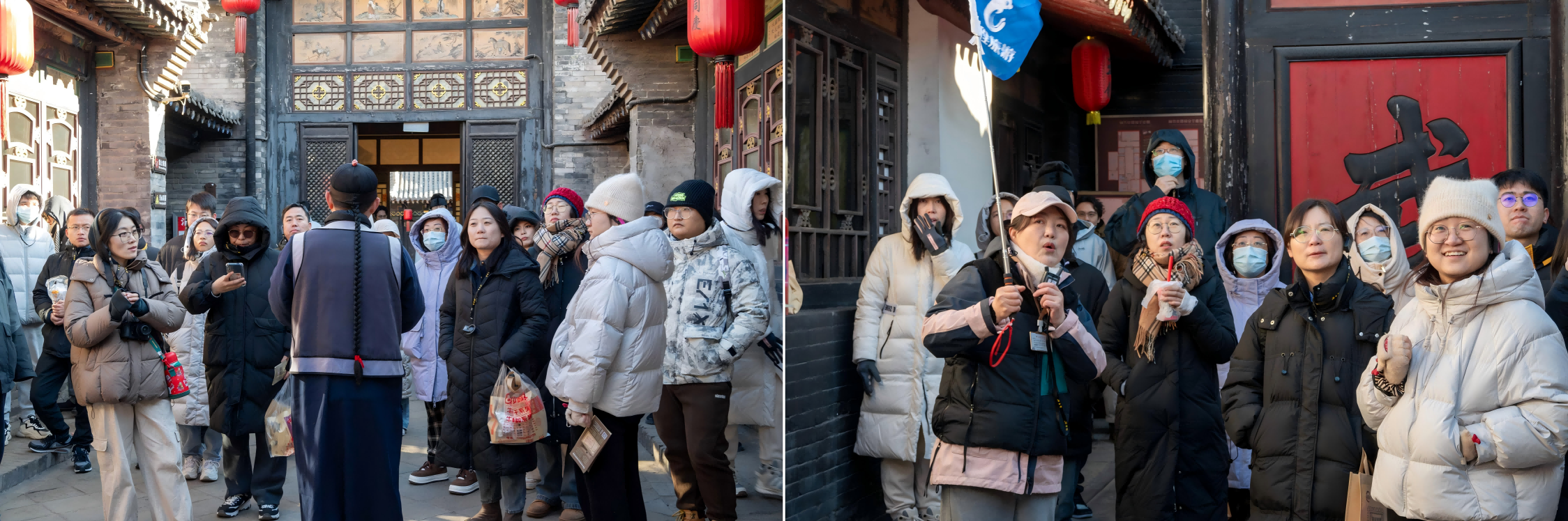 而后,众人入住平遥古城。现今中国境内保存最为完整的一座古代县城,由四大街、八小巷、七十二条蚰蜒巷构成八卦图案,展示了五个世纪以来中国建筑风格和城市规划的演变,堪称研究中国古代城市的“活样本”。大家登上古城墙,踏上石板路,游走在镖局、票号、县衙等历史遗迹间,仿佛穿梭在历史中,与古人擦肩而过,与昔日繁华相拥。
